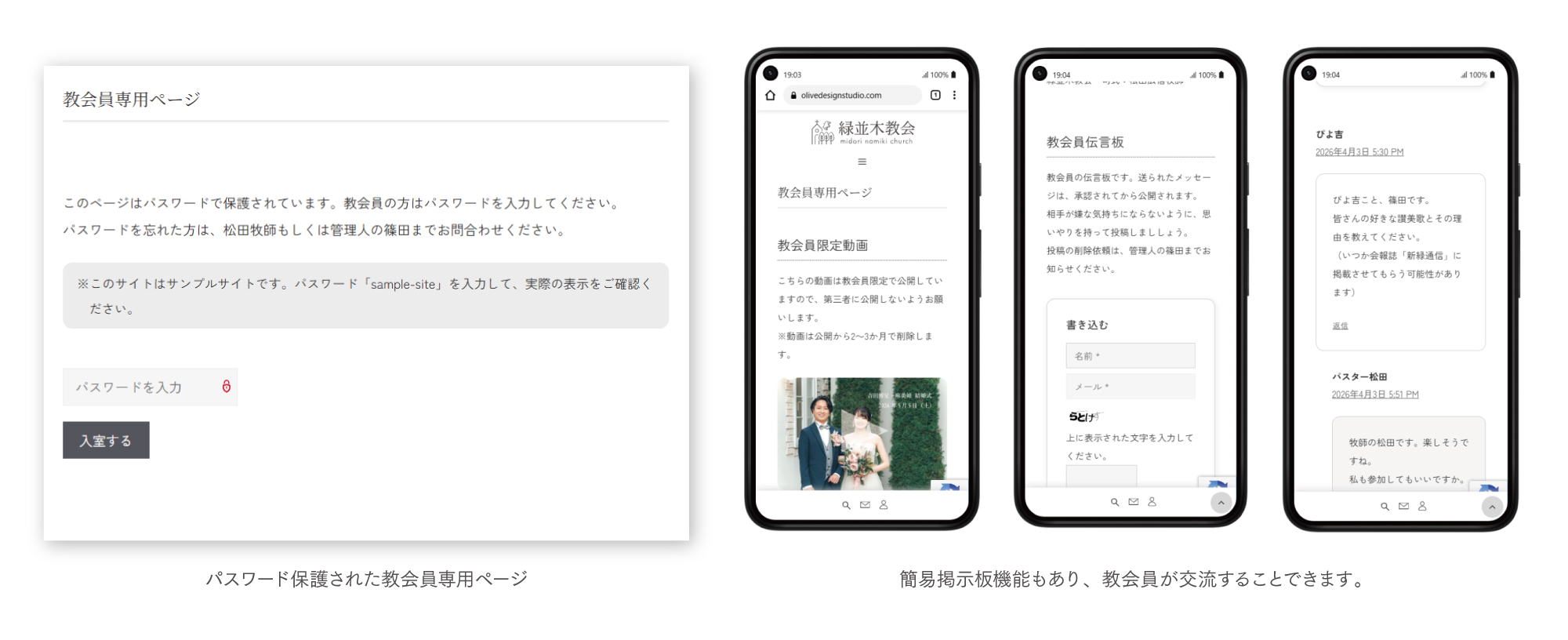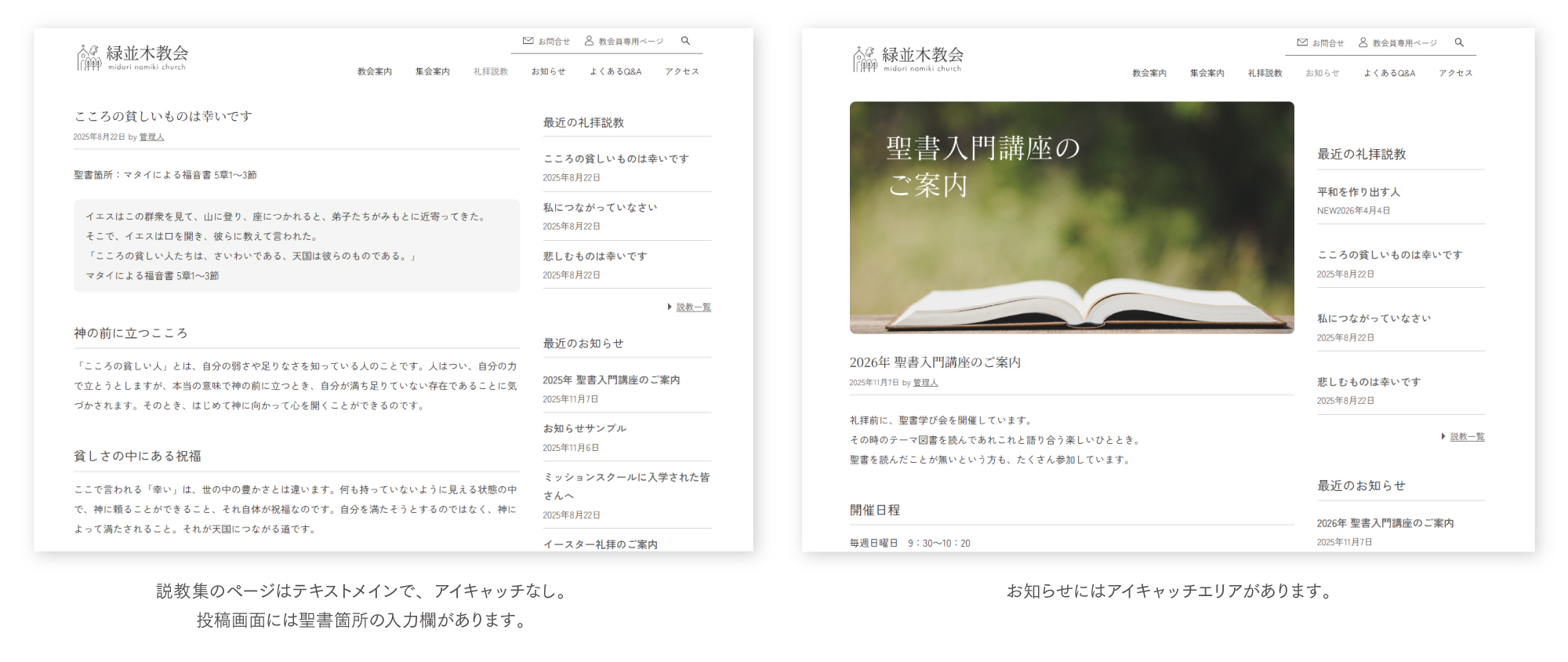 教会員向けの情報を掲載したり、コメント機能をアレンジした簡易掲示板も実用可能で、コミュニケーションの場として用いることもできます。